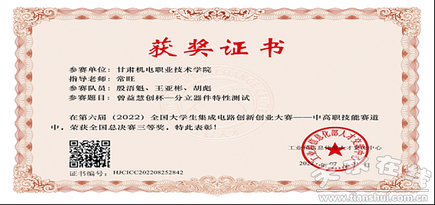 近日,全國(guó)大學(xué)生集成電路創(chuàng)新創(chuàng)業(yè)大賽——中高職賽道獲獎(jiǎng)結(jié)果公布。學(xué)校電氣工程學(xué)院常旺老師指導(dǎo),殷浯魁、王亞彬、胡彪等三名學(xué)生參賽的“分立器件特性測(cè)試”項(xiàng)目,全國(guó)大學(xué)生集成電路創(chuàng)新創(chuàng)業(yè)大賽——中高職賽道全國(guó)總決賽中榮獲三等獎(jiǎng)。