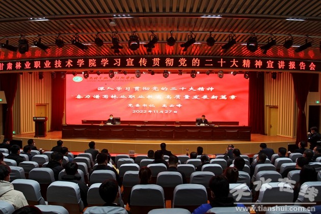 11月27日上午,甘肅林業(yè)職業(yè)技術學院舉辦學習貫徹黨的二十大精神宣講報告會,黨委書記高云峰以《深入學習貫徹黨的二十大精神 奮力譜寫林業(yè)職業(yè)教育高質量發(fā)展新篇章》為題,為全體師生宣講黨的二十大精神。黨委班子成員,全體中層干部,思政課教師、輔導員和學生代表線下參會,其他在校教師和學生線上參會。