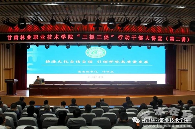 4月10日,甘肅林業(yè)職業(yè)技術學院舉辦“三抓三促”行動干部大講堂第二講,黨委副書記許祖生作了題為“推進文化自信自強,引領學院高質(zhì)量發(fā)展”的宣講報告。