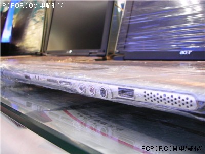 前置紅外線接口、音頻接口以及兩個(gè)長條狀的藍(lán)牙/無線網(wǎng)卡快捷鍵不用多說,可以說是Acer本本的特色了,不同的是TravelMate 4102LCi還把一個(gè)USB接口設(shè)置在前面,用起來非常方便。 在接口方面火線、4in1讀卡器、PC卡插槽、2×USB2.0、S-Video端子以及網(wǎng)絡(luò)接口,VGA接口一應(yīng)具全。