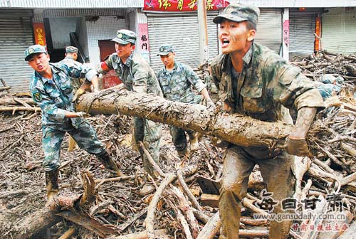 蘭州軍區(qū)某紅軍師戰(zhàn)士奮力清除成縣黃渚鎮(zhèn)街道上的雜物。本報(bào)記者周者軍攝