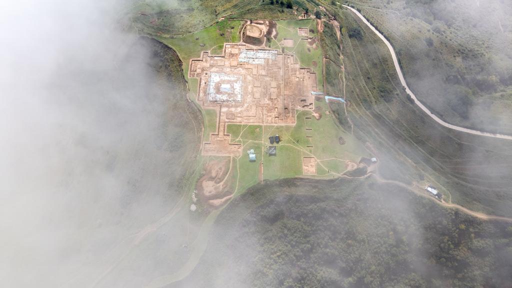 這是10月15日拍攝的甘肅省隴南市禮縣四角坪遺址考古發(fā)掘現場(無人機照片)。新華社記者 郎兵兵 攝