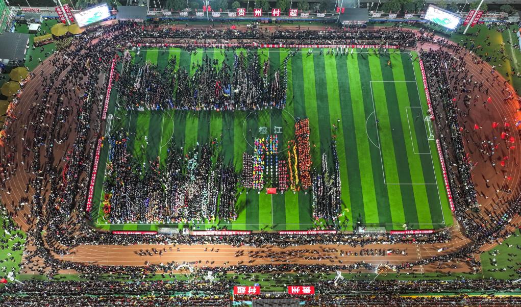 2025年貴州“村超”開(kāi)幕式現(xiàn)場(chǎng)(2025年1月4日攝,無(wú)人機(jī)照片)。新華社記者 楊文斌 攝