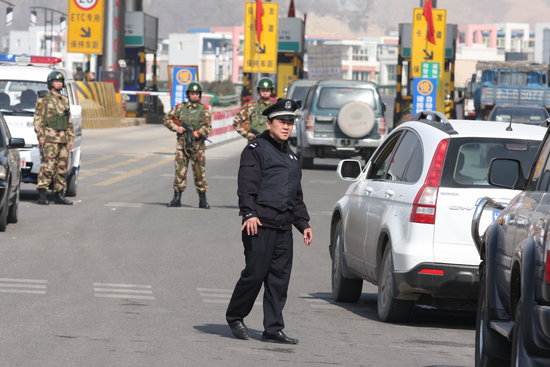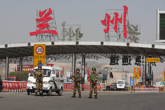 2010年3月10日上午,記者來到蘭州天水路高速路口, 民警持槍對每輛小轎車進行全面檢查。黨運/CFP