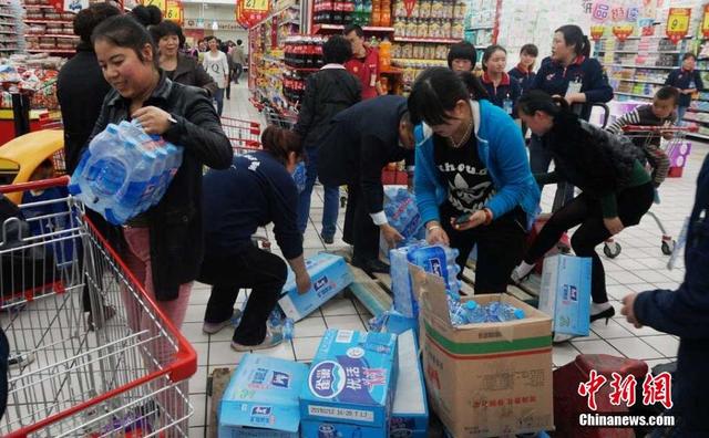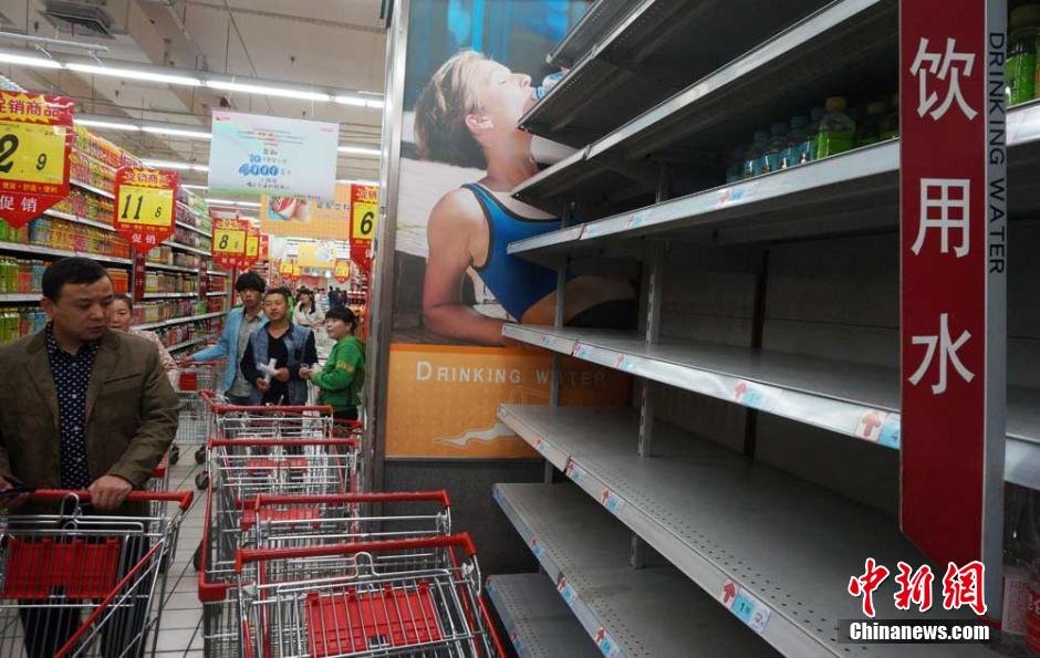 在蘭州一家超市,不少市民前來搶購礦泉水。不少超市貨架已售空。