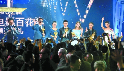 頒獎(jiǎng)晚會(huì)上,獲獎(jiǎng)人員向觀眾招手致意。本報(bào)記者 郁婕