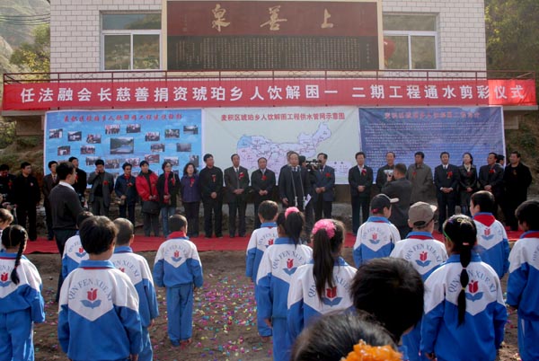 天水日?qǐng)?bào):11月5日,由全國(guó)政協(xié)常委、中國(guó)道教協(xié)會(huì)會(huì)長(zhǎng)任法融先生捐資修建的麥積區(qū)琥珀鄉(xiāng)人飲解困一、二期工程舉行竣工通水儀式。副省長(zhǎng)陸武成,全國(guó)政協(xié)常委、中國(guó)道教協(xié)會(huì)會(huì)長(zhǎng)任法融,省政府副秘書(shū)長(zhǎng)柳明,市領(lǐng)導(dǎo)張廣智、張和平、鄧炎喜、楊映芳、郭奇若、王欽錫、張續(xù)善出席竣工通水儀式。