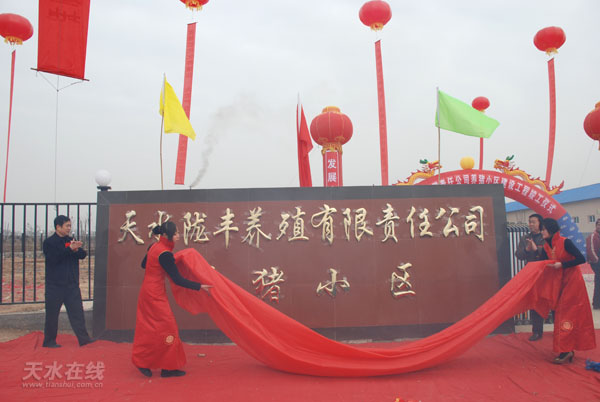 天水市畜牧局局長(zhǎng)鄭建明和麥積區(qū)委書(shū)記蔣曉強(qiáng)為天水隴豐養(yǎng)殖有限責(zé)任公司養(yǎng)豬小區(qū)揭牌。(麥積區(qū)委宣傳部)
