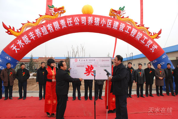 竣工儀式上,麥積區(qū)委副書(shū)記、區(qū)長(zhǎng)張克強(qiáng)為符合《三新陽(yáng)片區(qū)高效農(nóng)田和畜禽規(guī)模養(yǎng)殖建設(shè)獎(jiǎng)勵(lì)扶持暫行辦法》的天水隴豐養(yǎng)殖有限公司頒發(fā)了32萬(wàn)元獎(jiǎng)勵(lì)補(bǔ)助資金。