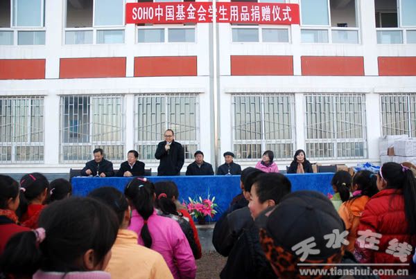 12月8日下午,潘石屹為潘集寨學校學生捐贈學習用品儀式在潘集寨學校舉行,SOHO中國董事長潘石屹,天水市教育局局長李淳,潘石屹的父親潘詩麟等出席了捐贈儀式。