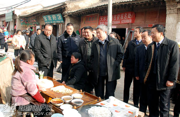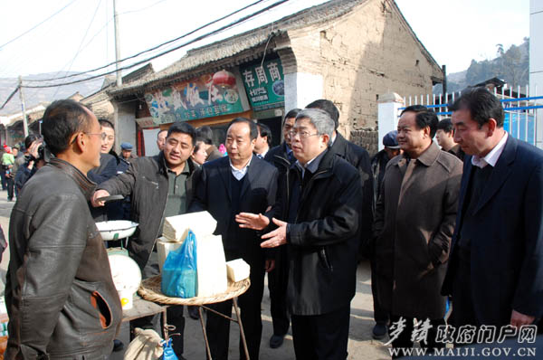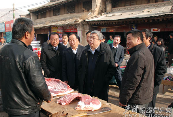 在古鎮(zhèn)視察期間,劉永富還不時(shí)駐足與正在做買(mǎi)賣(mài)的商販交談聊天,詢(xún)問(wèn)菜價(jià)、肉價(jià),了解貨源供應(yīng)情況,并聽(tīng)取了麥積區(qū)關(guān)于穩(wěn)定物價(jià)保障群眾基本生活情況匯報(bào)。