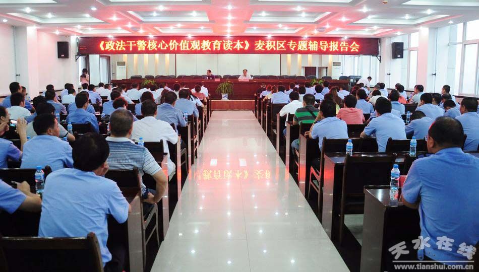 為了貫徹學(xué)習(xí)周永康同志在全國(guó)政法工作會(huì)議上提出的“忠誠(chéng)、為民、公正、廉潔”的政法干警核心價(jià)值觀,不斷增強(qiáng)政法隊(duì)伍的凝聚力和戰(zhàn)斗力。8月17日,全市政法系統(tǒng)《政法干警核心價(jià)值觀教育讀本》專(zhuān)題輔導(dǎo)報(bào)告會(huì)在麥積區(qū)舉行。會(huì)議由區(qū)委常委、政法委書(shū)記臧志軍主持,區(qū)法院、檢察院、公安分局、司法局、交警大隊(duì)、森林公安分局、消防中隊(duì)等200多名干警參加了專(zhuān)題輔導(dǎo)報(bào)告會(huì)。