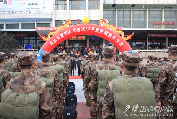 11月22日下午,天水火車站廣場,彩旗飄揚、鞭炮齊鳴、熱鬧非凡,麥積區(qū)隆重舉行2012年進藏新兵歡送大會。70名進藏新兵胸佩紅花、整裝列隊,在區(qū)領(lǐng)導(dǎo)和親朋好友的聲聲祝福中,即將奔赴雪域高原,為國戍守邊疆。