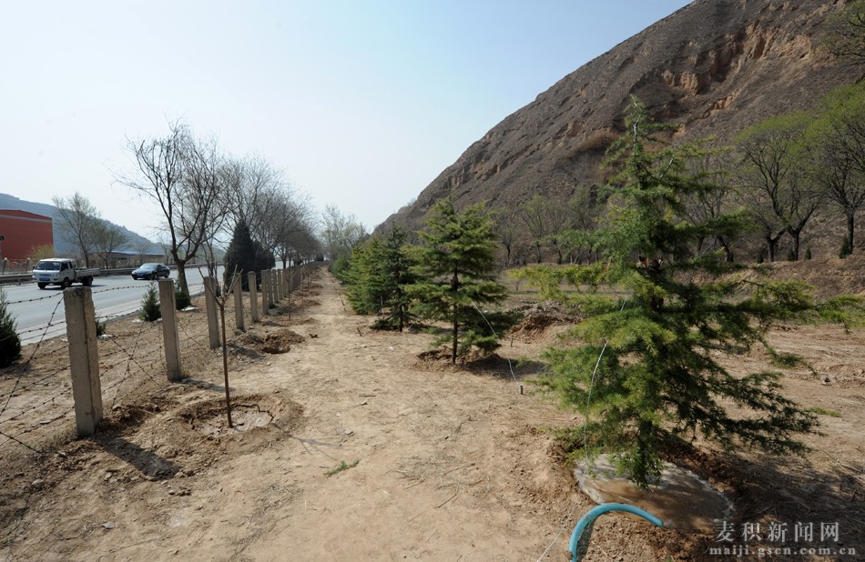 據了解,天巉公路麥積段綠化提升改造工程涉及麥積區(qū)渭南、中灘兩鎮(zhèn),規(guī)劃栽植香花槐等各類苗木1.03萬株,建設園林小品2處,工程預算總投資222.28萬元。計劃在渭南鎮(zhèn)左李村至中灘鎮(zhèn)后川村1.6公里,公路兩側5米的宜栽區(qū)內側間隔栽植櫻花、紅葉李,外側栽植雪松;在渭南鎮(zhèn)左李村,中灘鎮(zhèn)汪李村、陳堯村,栽植塔柏2200株、側柏3120株,綠化大地埂8800米;在渭南南雄核桃基地、中灘鎮(zhèn)張溝村區(qū)域,因地制宜,栽植塔柏、櫻花、紅葉李、香花槐、柳樹等苗木,建設綠化樹陣2處;在渭南鎮(zhèn)程村、后川村靠近天巉公路處建設景觀園林小品2處。目前,已栽植雪松、塔柏等苗木1300株,完成行道樹綠化1公里、大地埂綠化4200米,園林小品建設用地征用和場地平整工作已完成。