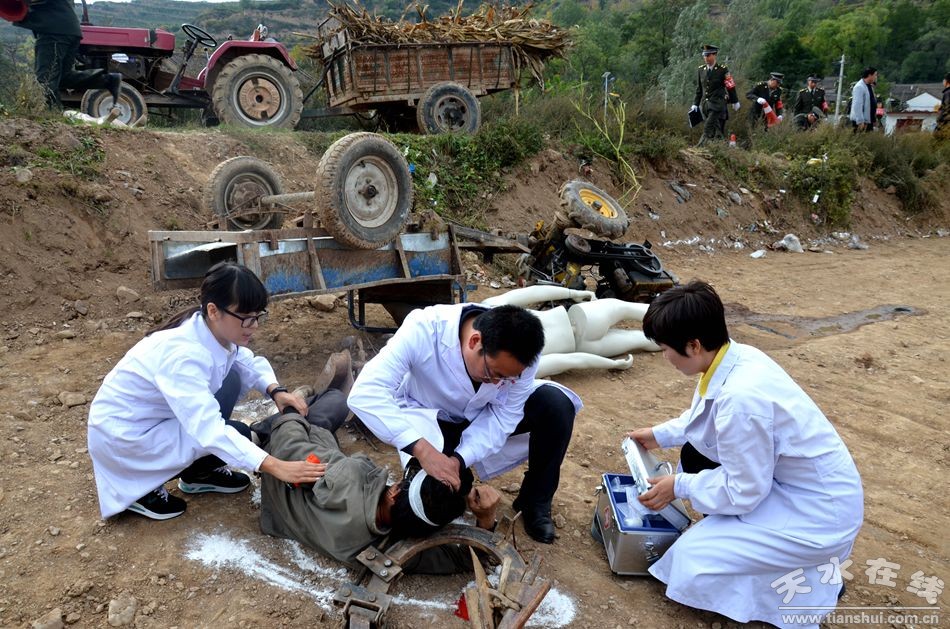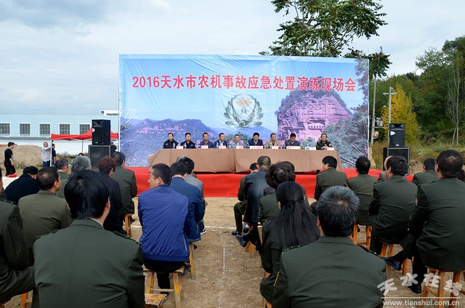 10月19日,由天水市農(nóng)業(yè)局、天水市麥積區(qū)人民政府主辦,天水市農(nóng)機監(jiān)理所、天水市麥積區(qū)農(nóng)業(yè)局承辦的全市2016農(nóng)機安全事故應急處置聯(lián)合演練現(xiàn)場會在麥積區(qū)甘泉鎮(zhèn)甘江村召開。省農(nóng)機監(jiān)理總站副站長宋天林、調研員李應強,市農(nóng)業(yè)局局長逯國文、副局長李文俊,市安監(jiān)局、市衛(wèi)計局、市公安交警支隊、市政府應急辦相關負責人;各縣(區(qū))農(nóng)業(yè)(農(nóng)機)局分管領導、農(nóng)機監(jiān)理站站長及事故處理員,麥積區(qū)政府副區(qū)長郭大偉、麥積區(qū)安監(jiān)局、衛(wèi)計局、公安分局、文廣局、交警大隊、農(nóng)業(yè)局等部門負責人、甘泉鎮(zhèn)政府領導及鄉(xiāng)鎮(zhèn)安監(jiān)站農(nóng)機安全監(jiān)管人員、甘泉鎮(zhèn)各村委會農(nóng)機安全管理人員共計100余人參加了現(xiàn)場演練觀摩活動。