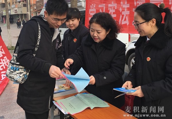 為深入貫徹落實黨的十九大精神和習(xí)近平總書記系列重要講話精神,增強全民法治觀念,推動全社會樹立憲法意識, 2017年“12·4”國家憲法日當(dāng)天,麥積區(qū)委宣傳部、區(qū)司法局以“學(xué)習(xí)貫徹黨的十九大精神 維護憲法權(quán)威”為主題,組織公、檢、法、司、稅務(wù)、工商、環(huán)保、衛(wèi)計等20余家依法治區(qū)成員單位和省林學(xué)院法治宣傳志愿者,在二馬路步行街開展了憲法法律集中宣傳活動。同時,各鎮(zhèn)(街道)、部分學(xué)校同步進行了集中宣傳活動,拉開了麥積區(qū)“12.4”國家憲法日系列宣傳活動序幕。