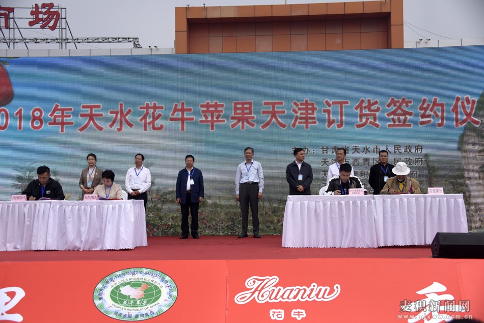 麥積新聞網(wǎng) 天津訊 9月28日上午,由甘肅省天水市人民政府、天津市西青區(qū)人民政府主辦,天水市麥積區(qū)人民政府、天津市西青區(qū)農(nóng)經(jīng)委、天水市林業(yè)局承辦的2018年天水花牛蘋(píng)果宣傳推介活動(dòng)訂貨簽約儀式和果品認(rèn)購(gòu)儀式在天津市西青區(qū)紅旗農(nóng)貿(mào)綜合批發(fā)市場(chǎng)隆重舉行。