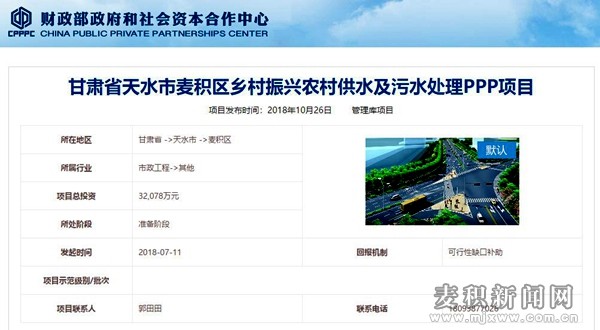 據(jù)財政部PPP項(xiàng)目管理庫2018年第三季報顯示,天水市麥積區(qū)鄉(xiāng)村振興農(nóng)村供水及污水處理PPP項(xiàng)目進(jìn)入國家財政部PPP項(xiàng)目管理庫。