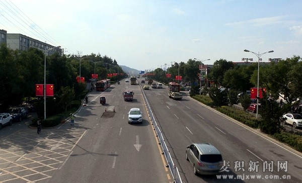 9月23日下午,記者先后走訪了馬跑泉市政廣場、馬跑泉中心大道、成紀大道麥積段、羲皇大道麥積段、天秀橋、埠南路、興隴路等地,每條街道、沿線商戶店面都懸掛上了紅旗。一面面五星紅旗迎風(fēng)飄揚,彰顯著最美的“中國紅”,洋溢著濃厚的喜慶氛圍,將麥積點綴得喜氣洋洋。