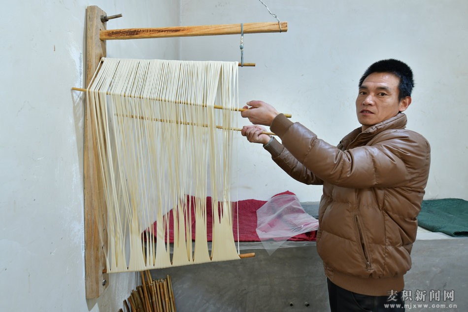 第二道工序是“上面”。這道工序是在第一天凌晨四點左右進行的,將醒好的小條繞在竹竿上,雙折后放進面槽。兩小時后,雙折的小條醒成七八十公分就可以拉面了。俗話說,“掛面若要拉得好,一握、一拽、二要挑”。揉搓好的小條被挑在棍子上,固定在室外早已搭好的架子上,一人在架子上將小條分開,另一人向下拽扯小條,直至拉成直徑約2亳米左右、長度約2-3米的掛面面條,然后晾曬在架子上。上架環(huán)節(jié)根據(jù)家庭勞力而定,人多的,可2—4人同時干,人少的可以一個人干。