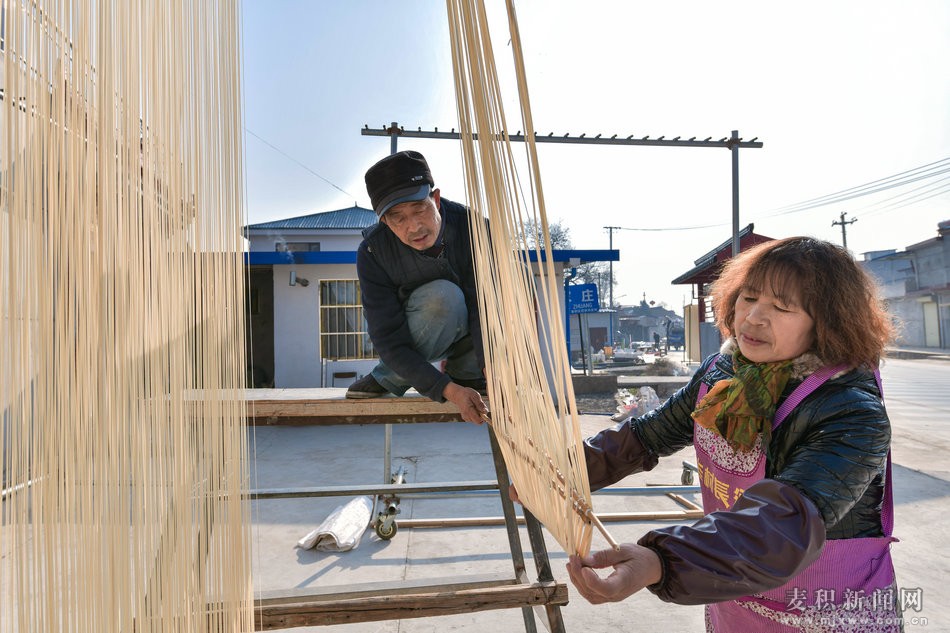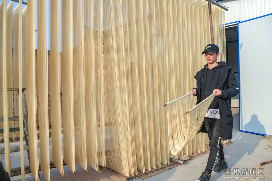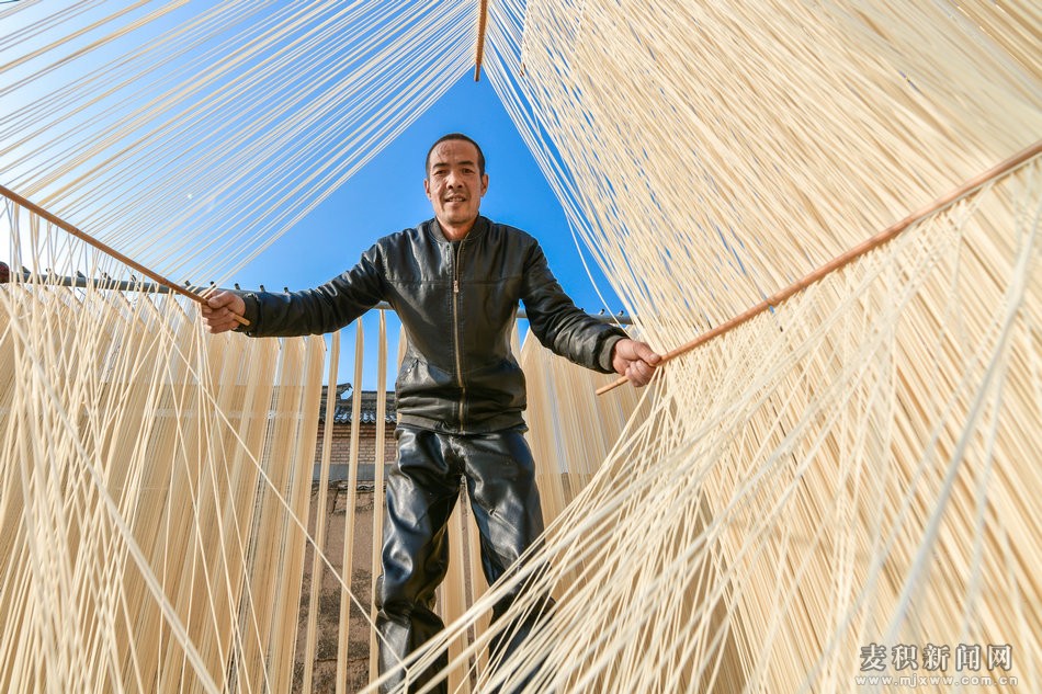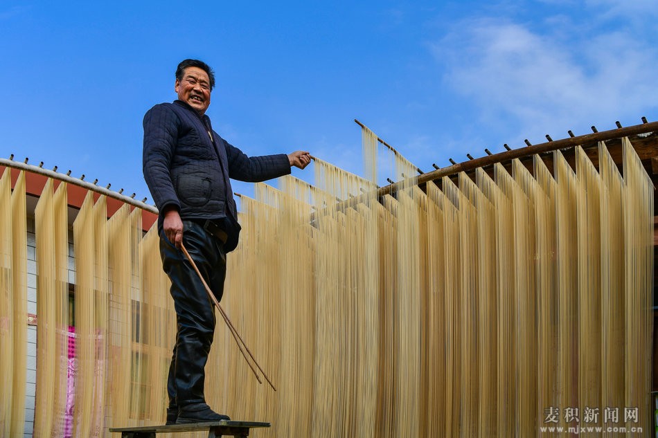 天水市麥積區(qū)石佛鎮(zhèn)黃莊村,由于家家掛掛面,城里人叫它“掛面村”。每到十一、臘月,家家院里,房前屋后掛滿了金黃色的掛面,如絲如線,形成一道美麗的風景。時下,隨著冬季節(jié)氣的來臨,天氣變得寒冷干燥起來,大多數(shù)地方忙了一年的農(nóng)民也進入了休息的時間,可黃莊村的村民卻家家忙著掛掛面了。