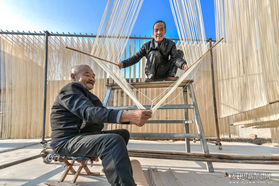 第三道工序是“曬面”。晾曬時間的長短根據(jù)氣溫決定,一般大約10—20分鐘,等晾曬的掛面結(jié)定型后,將面收進室內(nèi)再進行單晾。第三天早晨將掛面移到院里進行第一次晾西,大約5—6小時后掛面就會曬干。
