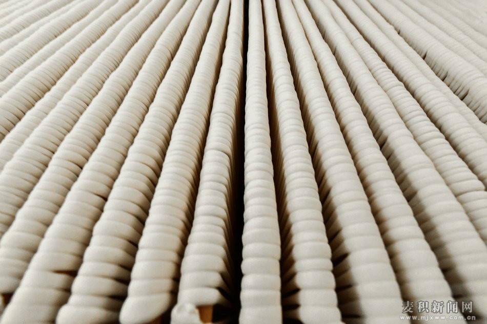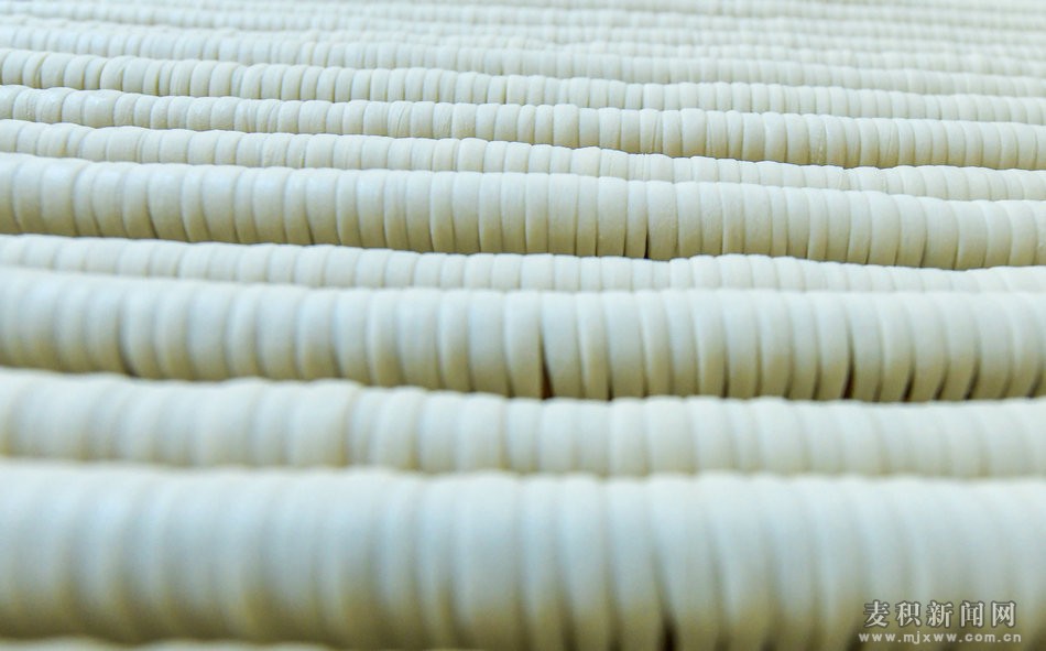 第四道工序是“收面”。收面還分定型后收面和曬干后收面兩個環(huán)節(jié)。第次收面是把定型好未干的掛面,掛在房內(nèi)醒面;第二次收面是掛面干透后,收到房內(nèi)案板上裁面扎把,這才算最后完工。