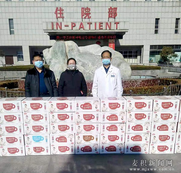 天水市中西醫(yī)結(jié)合醫(yī)院(市二院)是麥積區(qū)定點(diǎn)救治醫(yī)院,廣大醫(yī)務(wù)工作者連日來(lái)奮戰(zhàn)在抗擊疫情一線。為表達(dá)對(duì)一線醫(yī)務(wù)工作者的感謝,花牛鎮(zhèn)黨員夏鳳娥一家為醫(yī)院的醫(yī)務(wù)工作者捐贈(zèng)了價(jià)值14500元的奶茶145箱,讓他們?cè)诿β抵嗪纫槐滩铚嘏那椤?/P>