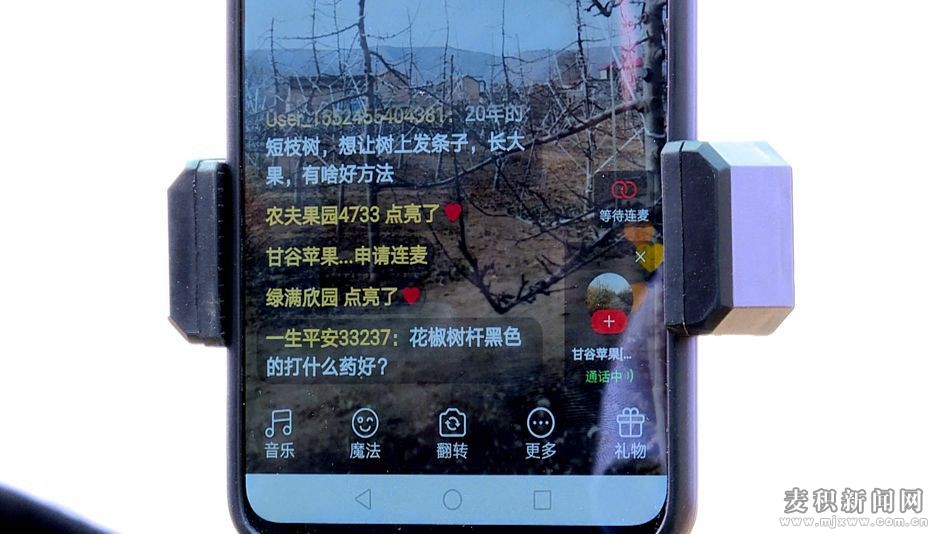 麥積區(qū)融媒體中心訊(記者 何彤彤 王雯)春回大地,萬物復蘇,一年一度的春季果樹培訓又拉開了序幕。2月17日下午,一場別開生面的農(nóng)藝技術培訓會在麥積區(qū)石佛鎮(zhèn)裴灘村的海霞種植家庭農(nóng)場舉行。培訓現(xiàn)場,農(nóng)技專家面對的不再是聚集的果農(nóng),而是正在直播的手機。新潮的快手、優(yōu)酷、直播與鄉(xiāng)土的果樹、修剪、嫁接在現(xiàn)場擦出了不一樣的火花。