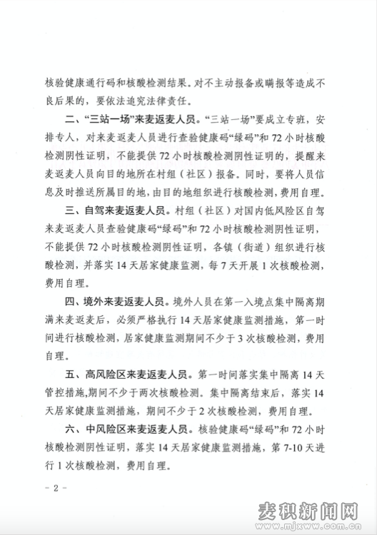 六、中風(fēng)險(xiǎn)區(qū)來麥返麥人員。核驗(yàn)健康碼“綠碼”和72小時(shí)核酸檢測(cè)陰性證明,落實(shí)14天居家健康監(jiān)測(cè)措施,第7-10天進(jìn)行1次核酸檢測(cè),費(fèi)用自理。