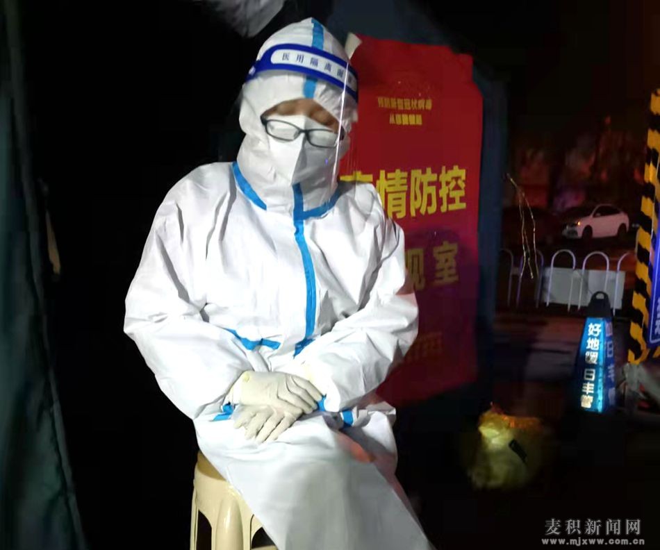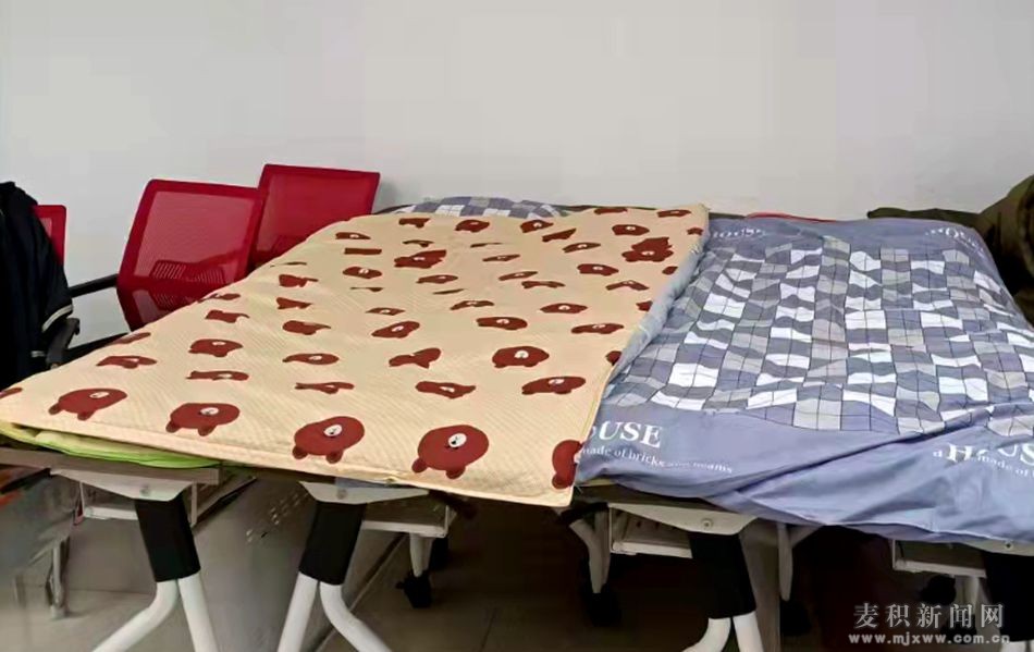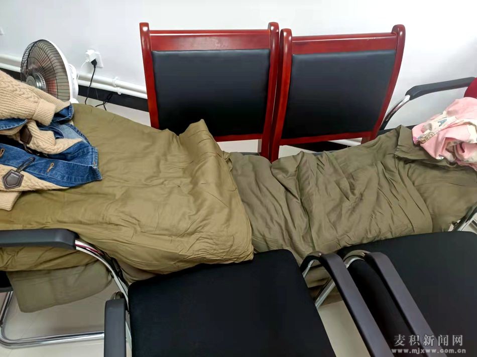 疫情發(fā)生以來(lái),書苑社區(qū)除1名孕婦以外,其余9名女同志迅速奔赴一線。為了延長(zhǎng)在崗時(shí)間全力以赴抗擊疫情,5名女同志毅然決然地搬到了社區(qū)住。一間再普通不過的會(huì)議室,幾把椅子一拼,上面鋪上一床薄薄的被子,一張簡(jiǎn)易的“床”就這樣制作完成了。書苑社區(qū)的5名女同志,從麥積區(qū)開展全員核酸檢測(cè)到現(xiàn)在的15個(gè)寒夜里,都是蜷縮在這樣的一張“床”上休息。現(xiàn)在他們的生活作息基本是每天凌晨1點(diǎn)休息,5點(diǎn)起,一天吃一頓,一頓管一天。社區(qū)書記毛艷妮笑著調(diào)侃自己:“這幾天熬了30年以來(lái)最狠的夜!碑(dāng)記者問到晚上冷不冷時(shí),毛艷妮說:“雖然后半夜還是會(huì)凍醒,但是蜷在一起就好了!