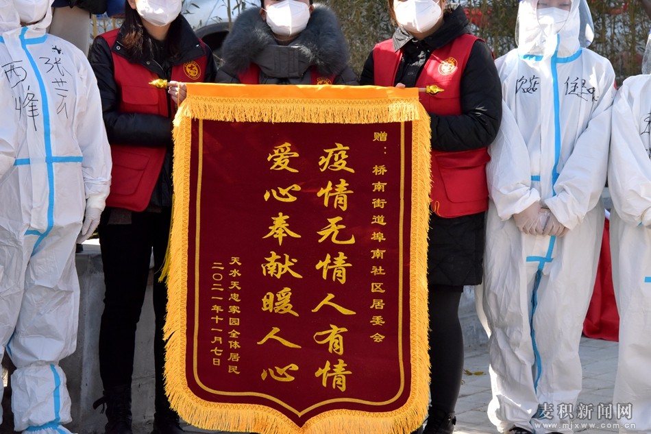 麥積區(qū)融媒體中心訊(記者 劉秋鈺 何彤彤 龍?jiān)骑w 趙文凱)立冬已至,天氣寒冷,但是在橋南街道埠南社區(qū)天忠家園卻發(fā)生了暖心的一幕:小區(qū)居民自發(fā)組織為奮戰(zhàn)在一線的醫(yī)護(hù)人員、志愿者、物業(yè)公司及橋南街道埠南社區(qū)贈(zèng)送了四面錦旗,以表達(dá)他們對(duì)所有抗疫一線工作人員的感恩之情。