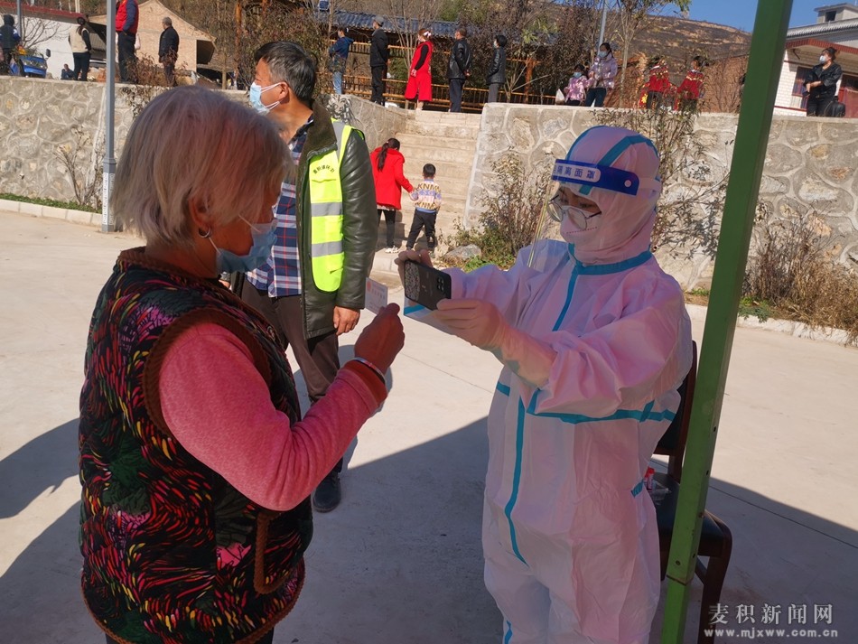 醫(yī)護(hù)人員第一時(shí)間趕赴核酸檢測(cè)點(diǎn)位,她們一邊指導(dǎo)群眾核酸檢測(cè)要“張開(kāi)嘴,發(fā)出a音,不要緊張”;一邊迅速熟練拿起醫(yī)用棉棒采樣。每天穿著厚實(shí)的防護(hù)服工作長(zhǎng)達(dá)8小時(shí)以上,她們就像勇士一樣沖鋒在前,總是在短暫的睡眠之后又開(kāi)始第二天的戰(zhàn)斗,她們已連續(xù)多日沒(méi)有好好休息了,卻奔赴麥積鎮(zhèn)15個(gè)村開(kāi)展檢測(cè)工作。截止目前,累計(jì)完成九輪57000余人次核酸采集工作。