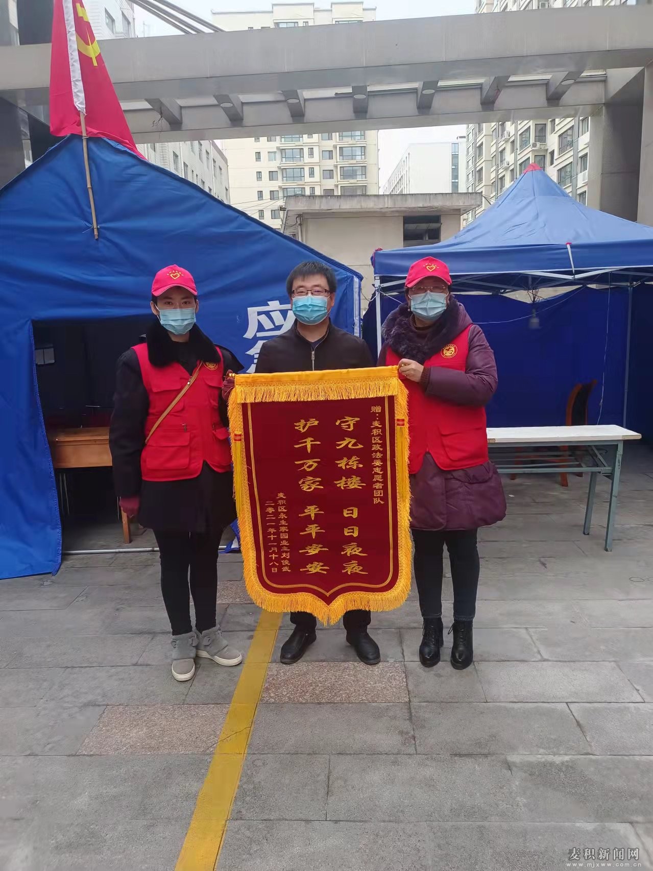 麥積區(qū)融媒體中心訊 11月19日上午,為感謝連日來奮戰(zhàn)在抗疫一線的麥積區(qū)委政法委志愿者的日夜堅(jiān)守,麥積區(qū)永生家園業(yè)主代表劉俊武特意將一面寫有“守九棟樓,日日夜夜;護(hù)千萬家,平平安安”錦旗送到區(qū)委政法委志愿者手中,代表永生家園486戶、1100余名業(yè)主對政法委志愿者表示感謝。