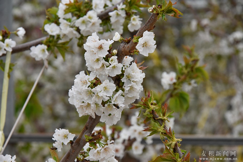 眼下正是櫻桃花開(kāi)花掛果前的重要管護(hù)時(shí)期,渭南鎮(zhèn)利豐農(nóng)民種植專(zhuān)業(yè)合作社的大棚內(nèi)櫻桃花已經(jīng)開(kāi)放,走進(jìn)180畝的櫻桃園內(nèi),映入眼簾的是滿(mǎn)眼的春色,櫻桃樹(shù)花開(kāi)正旺,潔白色的花朵一串串掛滿(mǎn)枝頭,空氣中彌漫著淡淡的清香。合作社也在做好工人自身防護(hù)的情況下積極開(kāi)展花期管理工作,在花叢間工人們戴著口罩,拉開(kāi)距離正在進(jìn)行疏花、除草。
