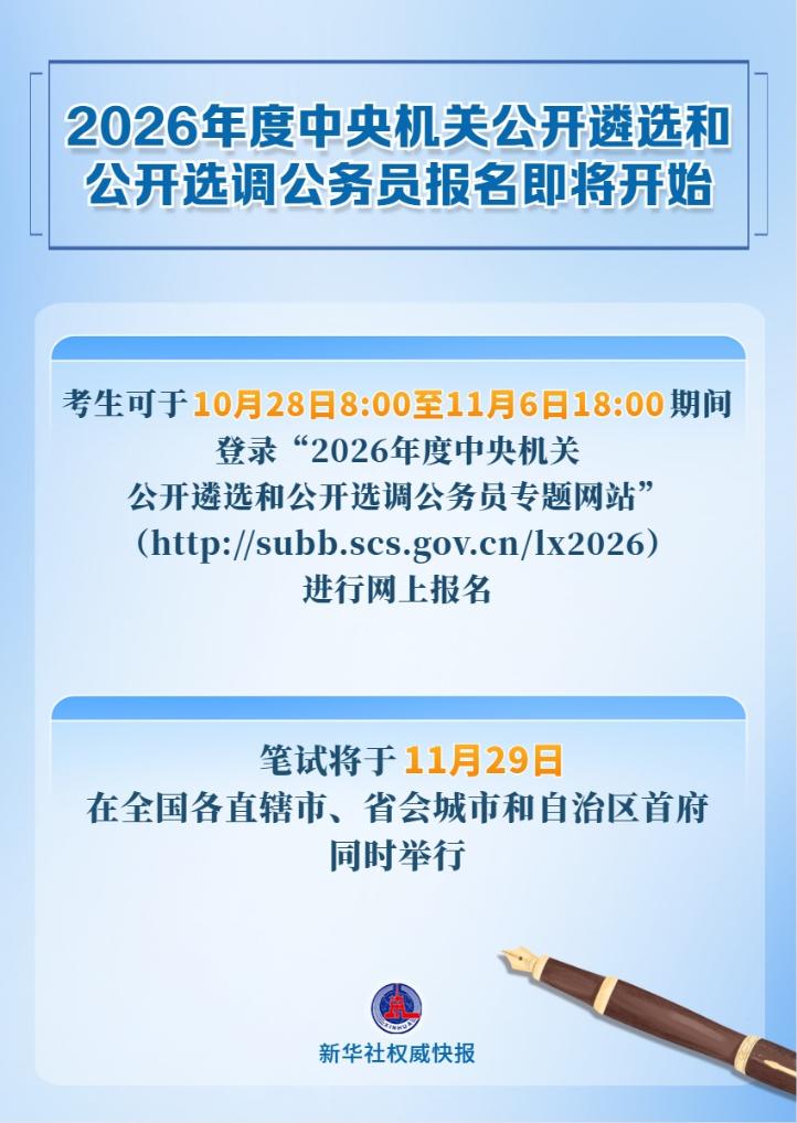 記者10月27日從國家公務員局獲悉,2026年度中央機關公開遴選和公開選調公務員報名即將開始,考生可于10月28日8:00至11月6日18:00期間,登錄“2026年度中央機關公開遴選和公開選調公務員專題網站”(http://subb.scs.gov.cn/lx2026)進行網上報名,筆試將于11月29日在全國各直轄市、省會城市和自治區(qū)首府同時舉行。據了解,本次公開遴選和公開選調中央機關共有35個部門參加,計劃選拔279人。