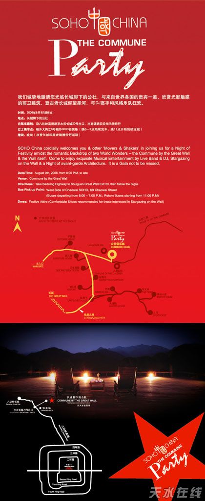 同時(shí),人人要做東道主,SOHO中國(guó)公司在奧運(yùn)會(huì)開(kāi)幕第二天,即8月9號(hào)在長(zhǎng)城腳下的公社舉辦一個(gè)聚會(huì),邀請(qǐng)了許多朋友參加我們的聚會(huì)。