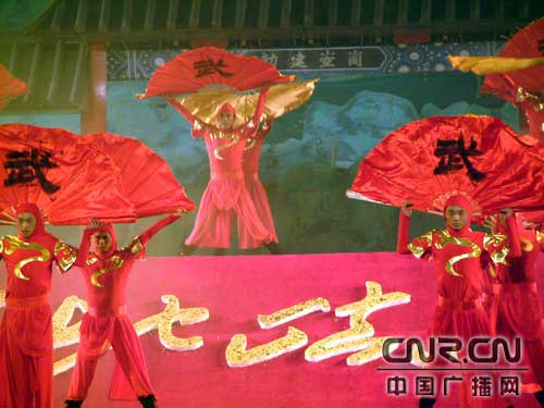 開(kāi)幕式上,甘肅省京劇團(tuán)、秦劇團(tuán)以及民族歌舞團(tuán)共同演繹了精彩的文藝演出《天地崆峒》,采用舞蹈、武術(shù)、聲樂(lè)、歌賦等藝術(shù)形式詮釋了古老厚重的崆峒文化,極富創(chuàng)意的襯托出了全民健身、喜迎奧運(yùn)的節(jié)賽主題。