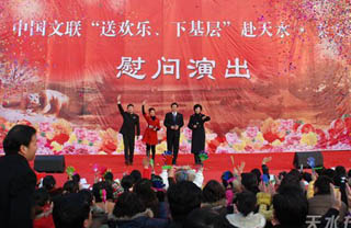 本報秦安12月29日訊(記者趙建卿)今天下午,秦安縣體育場內(nèi)人山人海,氣氛熱烈,由中國文聯(lián)主辦的“送歡樂、下基層”慰問演出在這里舉行。