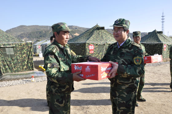 10月22日,秦安縣委副書記、縣長王東紅,副縣長、縣委辦主任郭雙江以及縣民政局負責人來到天水61師工兵營訓練基地,慰問正在參加隴原09軍事演練的秦安縣預備役官兵,并送去蘋果、方便面、純凈水、茶葉等慰問品。