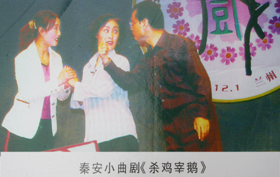 秦安小曲俗稱秦安老調(diào),是流傳于我縣民間的一種曲藝形式,距今已有500多年的歷史,2008年被列入甘肅省首批非物質(zhì)文化遺產(chǎn)名錄。秦安小曲劇《殺雞宰鵝》的編劇姚常德是秦安老調(diào)的愛好者、研究者,他的妻子蔡愛琴是第一個唱老調(diào)的女聲。女聲在老調(diào)中的出現(xiàn),為這種古老藝術(shù)走上戲劇舞臺打下了基礎(chǔ)。該劇曾獲第二屆甘肅戲劇紅梅獎劇本創(chuàng)作二等獎和演出優(yōu)秀獎,并于2007年榮獲中國戲劇文學(xué)獎小型劇本二等獎,此次又獲第六屆敦煌文藝獎戲劇類三等獎。