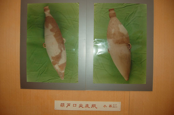 大地灣的制陶業(yè)也相當(dāng)發(fā)達(dá)如發(fā)掘出的一件大型圓底龜紋彩陶盆,口徑50.2厘米,卷折唇,曲折腹,圓底,口沿下有魚紋繞周,形象逼真,花紋流暢,為同類器物之冠。著名的彩陶人頭瓶,通高32厘米,口徑4.5厘米,人頭形口塑有清秀的五官,整齊的劉海,微鼓的鼻翼,尖圓的下頷,面呈鴨蛋形,雙耳有穿孔,口目鏤空,顯得生趣盎然。瓶身以優(yōu)美的弧線為輪廓,由弧線三角形和柳葉紋組成流暢的圖案,造型優(yōu)美,動人心弦。在寬帶紋環(huán)底型號陶體內(nèi)壁已發(fā)現(xiàn)有十多種獨特的彩色符號,距今7000年,為研究中國古代文字的形成和發(fā)展提供了新資料。