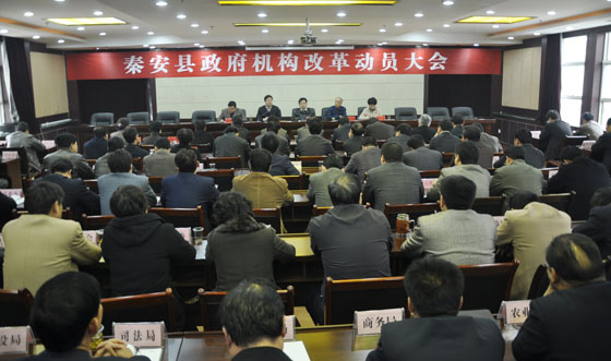 為了認(rèn)真貫徹黨中央、國務(wù)院和省委、省政府關(guān)于深化行政管理體制改革的會(huì)議精神,嚴(yán)格按照市編委批復(fù)的縣政府機(jī)構(gòu)改革方案,開展政府機(jī)構(gòu)改革的各項(xiàng)工作,確保這項(xiàng)工作任務(wù)的全面完成,10月30日,秦安縣召開政府機(jī)構(gòu)改革工作動(dòng)員大會(huì),全面安排部署縣政府機(jī)構(gòu)改革實(shí)施工作?h四大組織在家領(lǐng)導(dǎo),各鄉(xiāng)鎮(zhèn)黨委書記、鄉(xiāng)鎮(zhèn)長,縣直各部門主要負(fù)責(zé)人共120多人參加了會(huì)議。