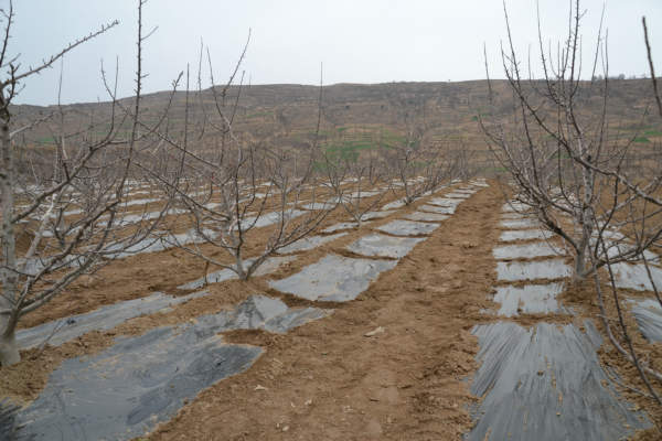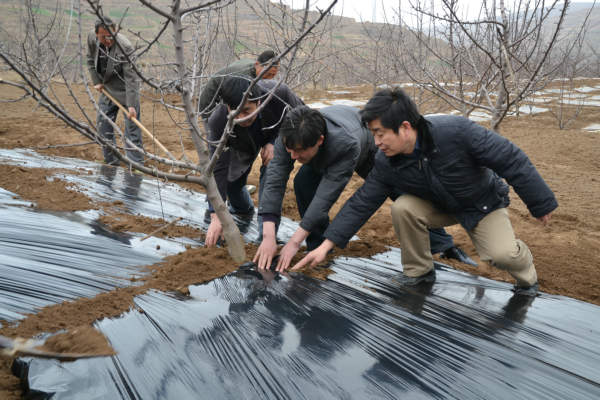 走近了記者才發(fā)現(xiàn),原來(lái)大家正在熱火朝天地給果樹蓋黑膜,只見十幾個(gè)人在果園里忙前忙后,有說(shuō)有笑,有的在蓋膜,有的在挖溝,有的在加土,連記者走到他們身邊都沒有發(fā)現(xiàn)。