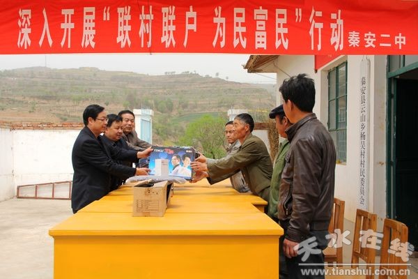 秦安二中是全縣獨立高中之一,學(xué)校聯(lián)系的是云山鄉(xiāng)楊吳村,下轄4 個自然村,有141戶627人,其中有貧困戶22戶,村上有果園420畝,但果樹老化,加之粗放管理,農(nóng)民收入單一,全村因病致貧人數(shù)占相當(dāng)比例。二中積極響應(yīng)“聯(lián)村聯(lián)戶”行動,前期開展了深入細(xì)致的入村調(diào)研,了解到已建成的村陣地缺少辦公桌椅及文件盒等用品,所以這次為基層組織建設(shè)“增磚添瓦”,為該村“雪中送炭”,及時送去辦公設(shè)備。