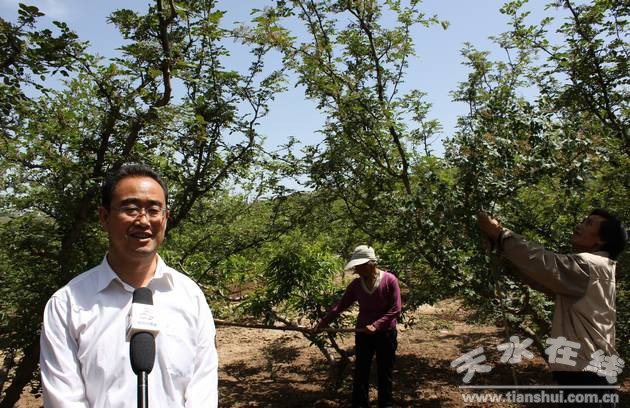我們趕往高廟村,見到了鄉(xiāng)黨委書記董旭強(qiáng)。他正在王喜林家的園中查看花椒的結(jié)果情況,并問他一年的收入多少,椒園管理還有什么問題。王喜林修剪著長得太旺的枝條,回答說:“一年收入有一萬元左右,我們就靠花椒致富,花椒成了家里的‘錢疙瘩’,現(xiàn)在有些病蟲害還沒辦法治,希望書記能聯(lián)系技術(shù)員來看看。”董旭強(qiáng)一口答應(yīng)了。