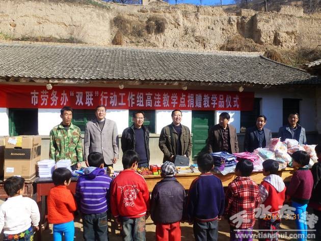 王窯鄉(xiāng)位于秦安縣西部,距縣城17公里,全鄉(xiāng)有23個(gè)村委會(huì),農(nóng)業(yè)戶數(shù)4687戶22060人,全鄉(xiāng)貧困線以下人口為3696戶16400人,評(píng)議確定特困戶690戶3294人。至目前,各聯(lián)系單位和聯(lián)系干部都已與與貧困村進(jìn)行了對(duì)接,與各貧困戶進(jìn)行了聯(lián)系。其中天水師院黨委書記杜松奇多次到魏灣村,為薛彥東的母親診斷病情,送上藥品。市社保局勞務(wù)辦為高洼村教學(xué)點(diǎn)捐贈(zèng)了教學(xué)用品儀式”。鄉(xiāng)干部宋長祥發(fā)揮自己果樹管理方面的特長,義務(wù)幫何奮元修剪蘋果樹42棵、花椒樹60棵,受到群眾的好評(píng)。