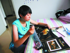 7月7日,在秦安縣城西北角一處小區(qū)的樓內(nèi),記者見到清純可愛的秦安一中應(yīng)屆高中畢業(yè)生王典。初見她時,她正半蹲半跪在自己小床邊的地上,認(rèn)真仔細(xì)地繡著十字繡“曲院風(fēng)荷”。