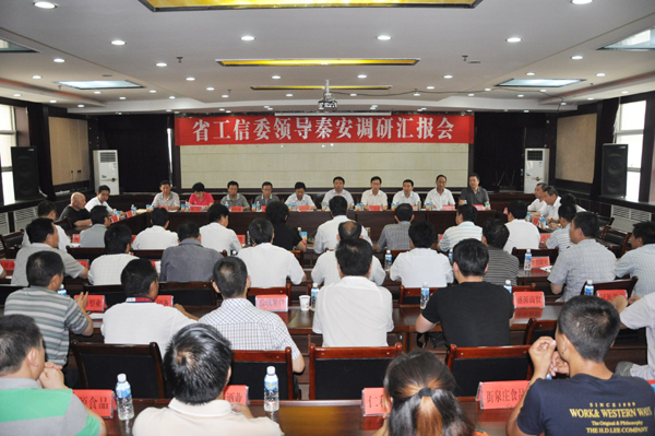 在隨后召開的調(diào)研匯報會上,縣委副書記、縣長程江芬就秦安縣工業(yè)和信息化工作情況作了匯報,省工信委主任李平作了講話,縣委書記王東紅主持匯報會并代表縣委、縣政府作了表態(tài)發(fā)言。