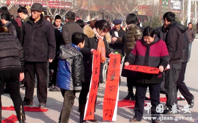為把春節(jié)的祝福送到千家萬戶, 2月11日上午,秦安縣圖書館在秦安文化廣場,開展“迎新春•送春聯(lián)”活動,邀請多位書法家現(xiàn)場書寫春聯(lián)并免費(fèi)贈送給群眾。